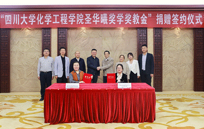 在李正赤、姜维平等与会嘉宾的共同见证下,重庆圣华曦药业股份有限公司总经理助理沈晓静、四川大学教育基金会副秘书长贾秀娥代表双方签署协议。