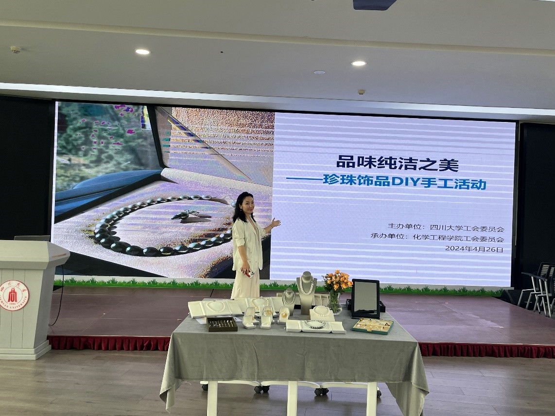 4月26日下午,由四川大学工会主办、yL23411永利官网登录工会承办的“品味纯洁之美——工会珍珠品鉴及珍珠饰品制作活动”在文华活动中心六楼多功能厅顺利举办,活动吸引了来自校内多个单位50余位女职工的热情参与。
