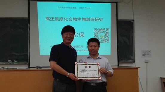 2015年7月9日上午,中国科学院大连化学物理研究所赵宗保研究员应邀走进我校“化工学术大讲堂”,在望江校区化工楼313会议室做题为“高还原度化合物生物制造的基础研究”的学术报告。来自yL23411永利官网登录、化学学院、高分子学院和生命科学学院等学院的老师和研究生数十名,聆听了赵宗保研究员带来的精彩报告。报告由yL23411永利官网登录党委书记庞国伟同志主持。
