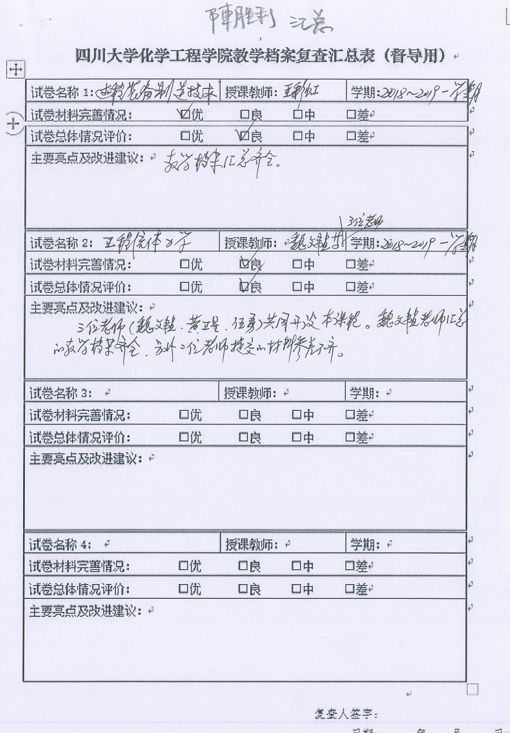 此次共抽查了19套试卷档案,六位督导老师将试卷的抽查中发现的问题进行逐条梳理,形成每一份试卷档案的试卷复查意见和试卷的复查汇总意见。意见经学院教务办公室,分别反馈给对应试卷负责老师和过控系的系主任和副系主任,以便于进一步的规范、完善试卷档案,促进教学改进与提高。