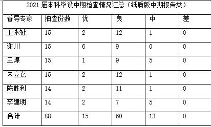 在上学期参与2021届毕业生论文开题报告的基础上,本期进行了毕业论文中期检查、论文答辩检查、毕业论文抽查工作。每个环节的工作均有小结和建议意见。