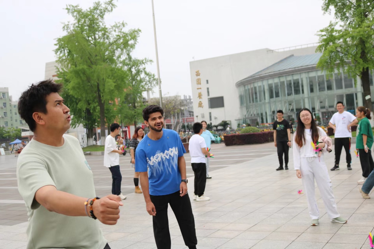 在活动开始前,主持人向各位同学讲解了谷雨和毽子相关文化知识,提醒同学们在运动过程中注意个人安全。正式开始后,同学们首先开始练习起来,熟悉毽子的规则和技巧,老师也和同学们一起,共同踢动脚上的毽子。之后,同学们几个人围成一个圈,相互传递,一起戏耍起来。最后,留学、港澳台学生和本硕博学生一起分组进行了踢毽子比赛,展现出了默契的配合和精湛的技艺。色彩斑斓的毽子在空中划出一道道优美的弧线,伴随着阵阵欢声笑语,现场气氛热烈而欢乐。